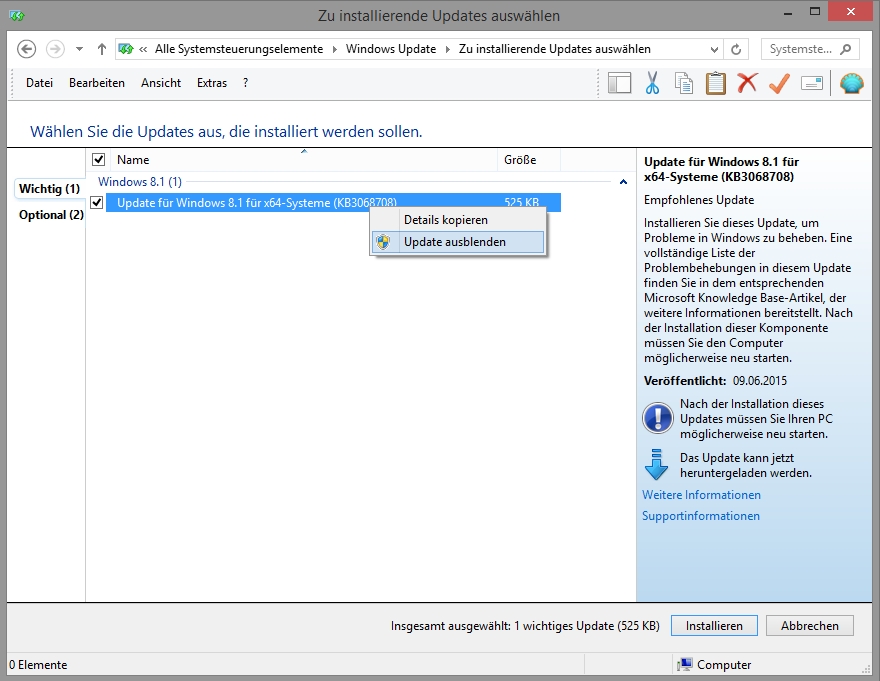 Ab jetzt ignoriert Ihr Rechner dieses eine Update und wird es nicht noch einmal installieren.